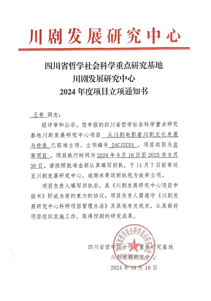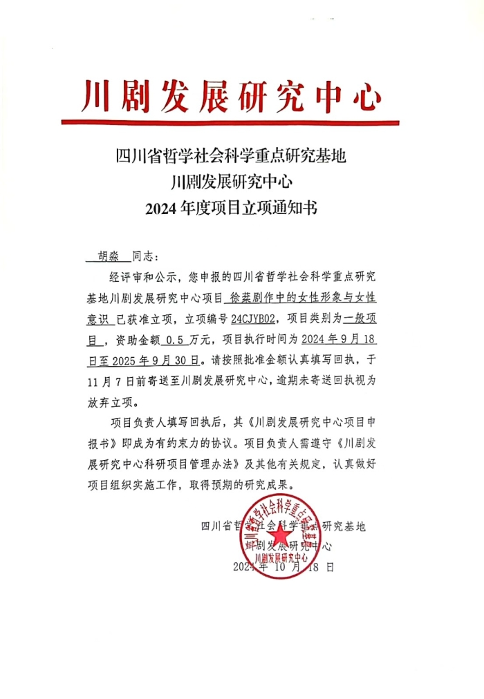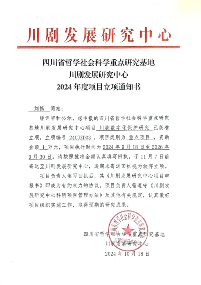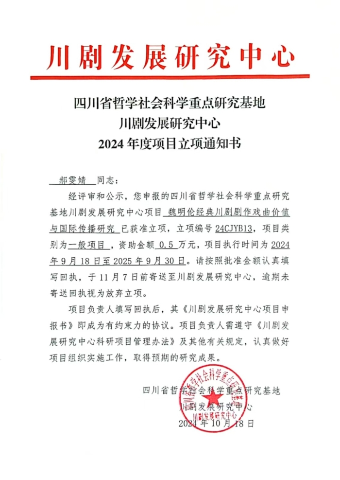 近日,四川省哲学社会科学重点研究基地川剧发展研究中心公布2024 年度项目立项,我校有5个项目获此立项。具体情况如下: