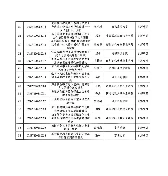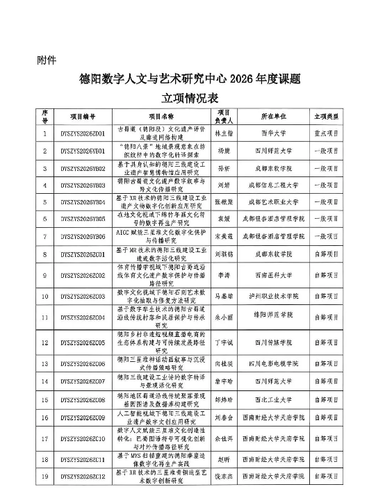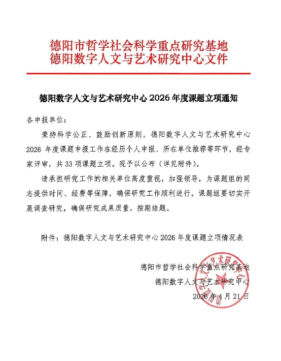2026年4月23日,德阳数字人文与艺术研究中心公布了2026年度项目立项名单,我校1项课题获资助立项,详情如下: